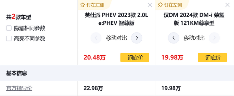 從價格來看,售價22.98萬元的英仕派PHEV智尊版,比漢DM-i榮耀版121KM尊享型高了3000元,但從經銷商的終端優惠來看,英仕派PHEV的實際到手價格只會更低。