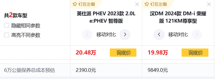 在養車成本上,某權威汽車網站經過大量網友反饋預估,英仕派PHEV的6萬公里保養總成本不到2400元,而漢DM-i的總成本卻接近1萬元,這也與車質網上一些網友關于汽車質保的吐槽不謀而合。